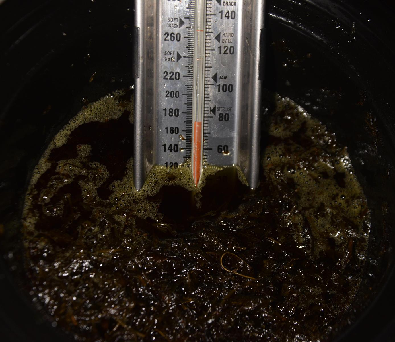 Add the weed and mash it all up. I use the cooking thermometer to do this, but you can use a wooden spoon. An electric hand blender would be better, as that would be similar to what goes on inside the Magical Butter machine.