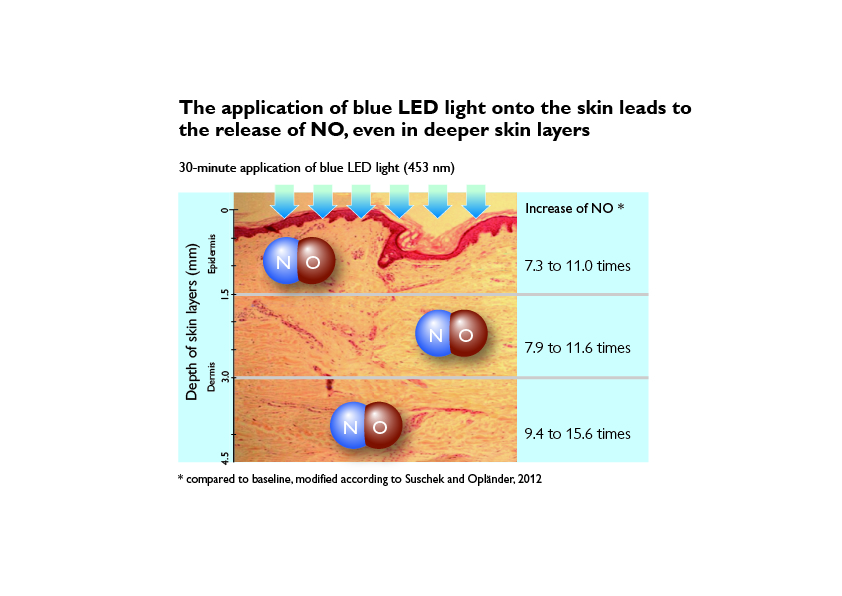 Researchers have also discovered that blue LED light at a wavelength of 453 nanometers leads to more nitric oxide (NO) being released in the skin area that was exposed to it.