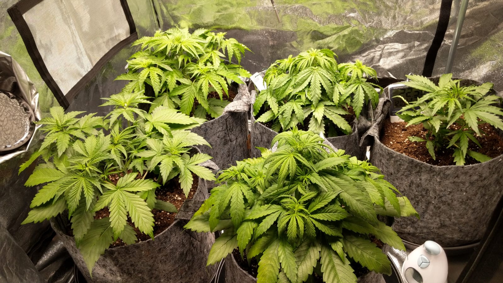 In addition to this i put the second clip fan on the highest setting indirectly gently moving the plants so any critters can’t take refuge on our foliage. Each time i check them i give the pots a little shake and see if anything is flying around etc… abit OCD i know. However in the past week they have grown tremendously, the tallest is now 18.5 inches and the smallest is 14inches, so i don’t think that the small clip fan will suffice for much longer. Next week i will be installing a 16” oscillating fan into the tent and removing the small clip fan to keep up with the girls.