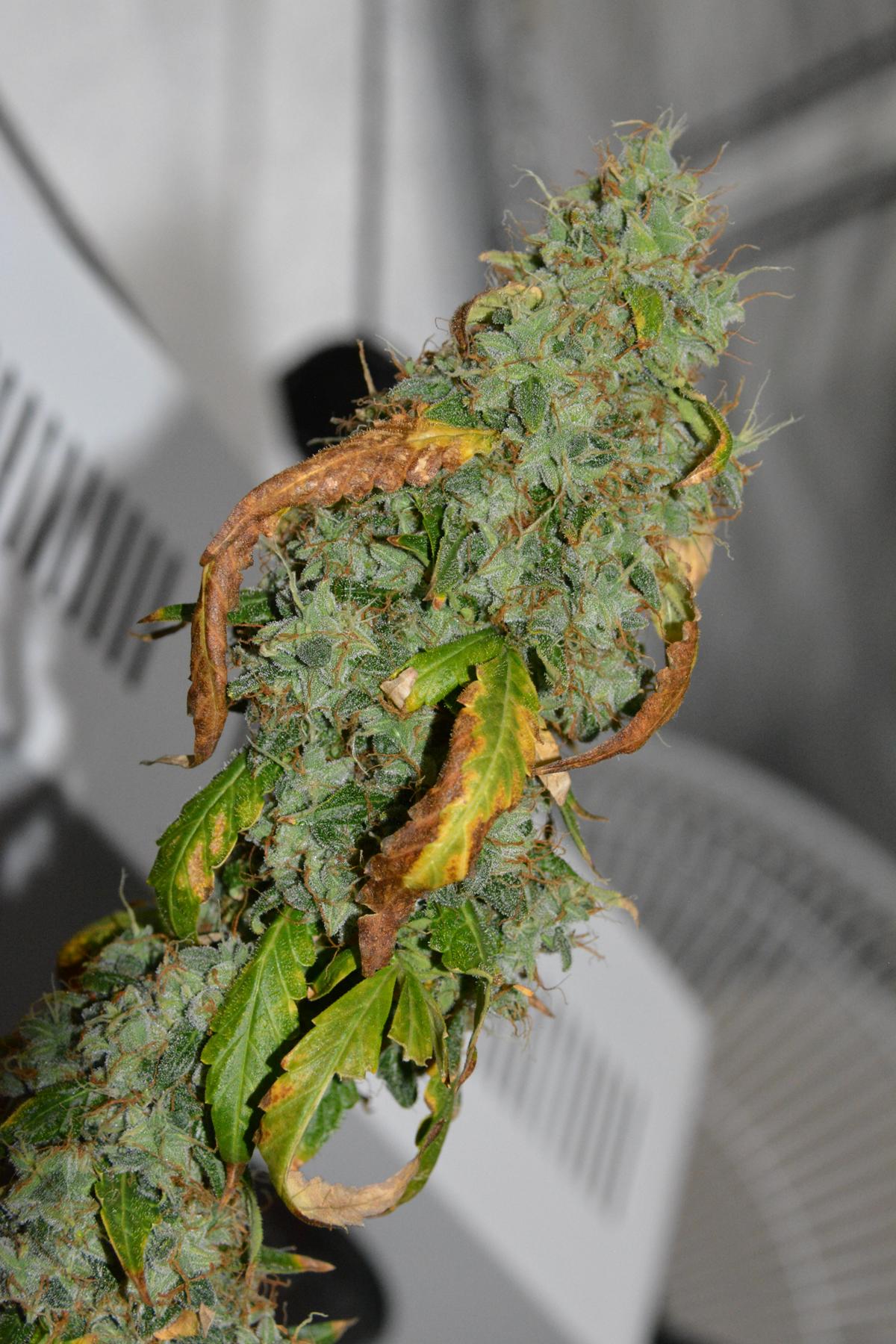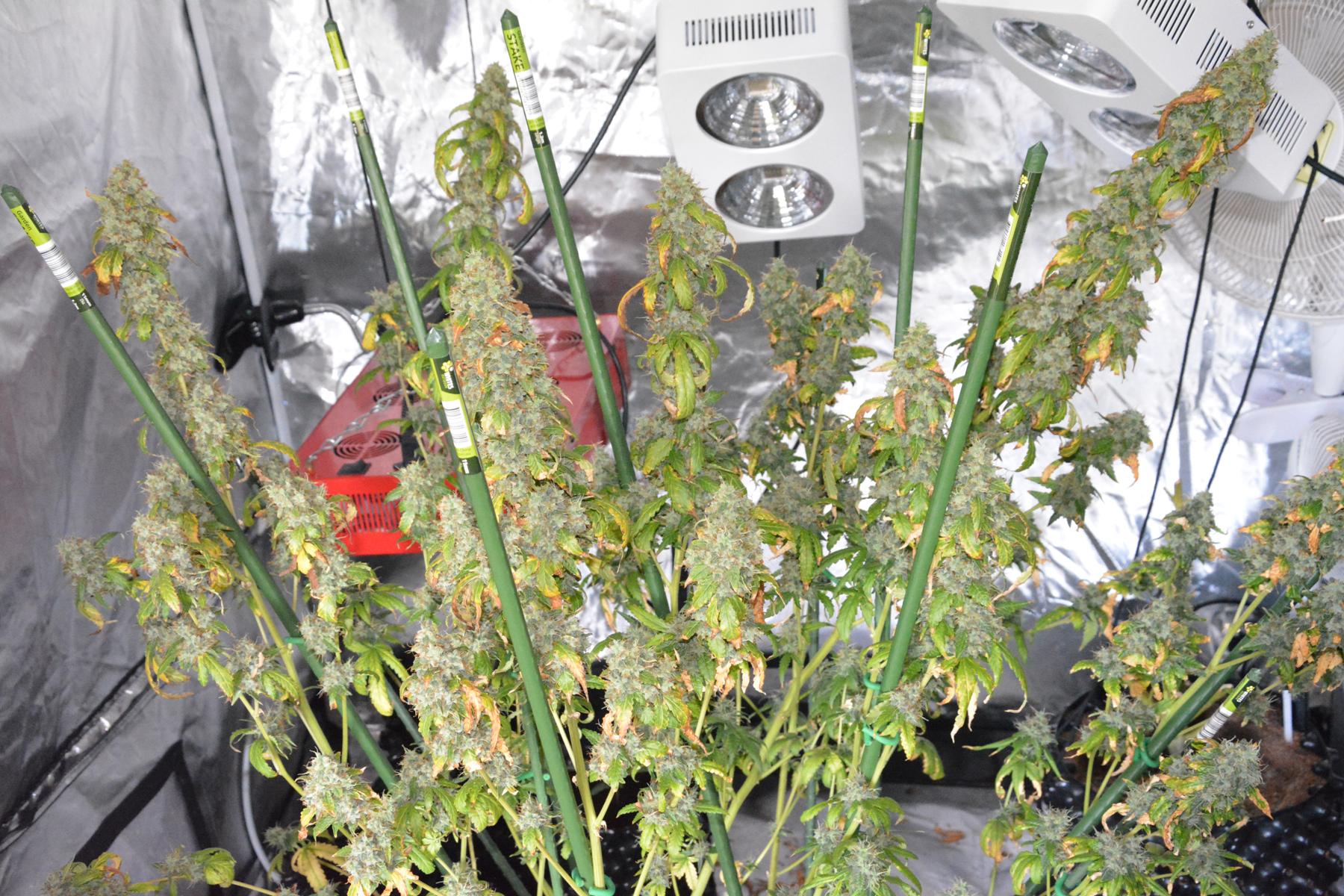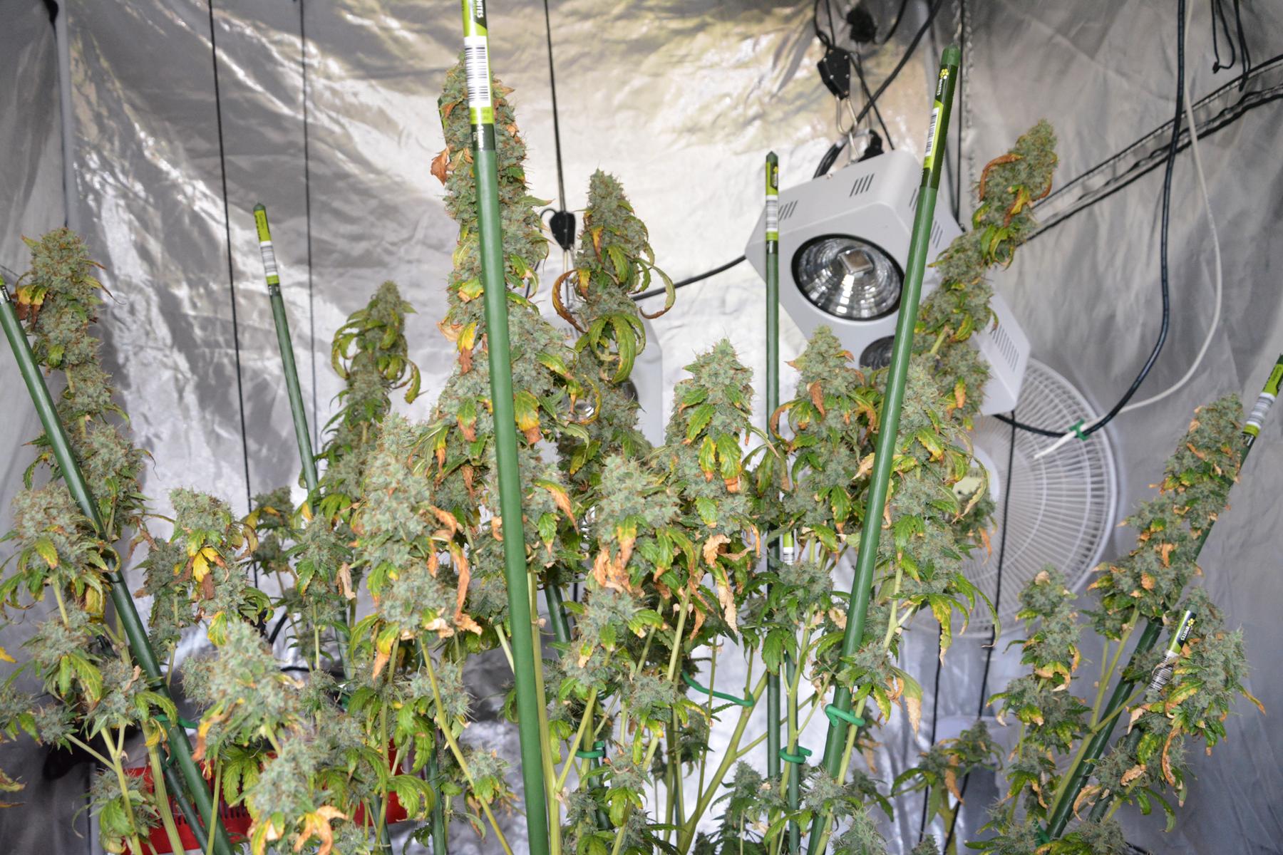 This means harvest will be at day 121. That might sound strange for a 75 day finishing Auto, but don't forget she got accidentally topped when our landlord made a surprise inspection, then later on after some kind of insect damage, I hacked the shit out of her on day 29 by mainlining her. By the end of my butchery, I had reduced her to 6 stems which I supercropped out into a radial shape, and then removed all leaves except the tops of each stem. 2 days after that I topped each stem again, so I'm not surprised she's taken this long to mature. In effect I made a 30 day old plant go back to 7 days old..... put her back 3 weeks! So by my calculations, she will be effectively 100 days old on chop day, which is more understandable.