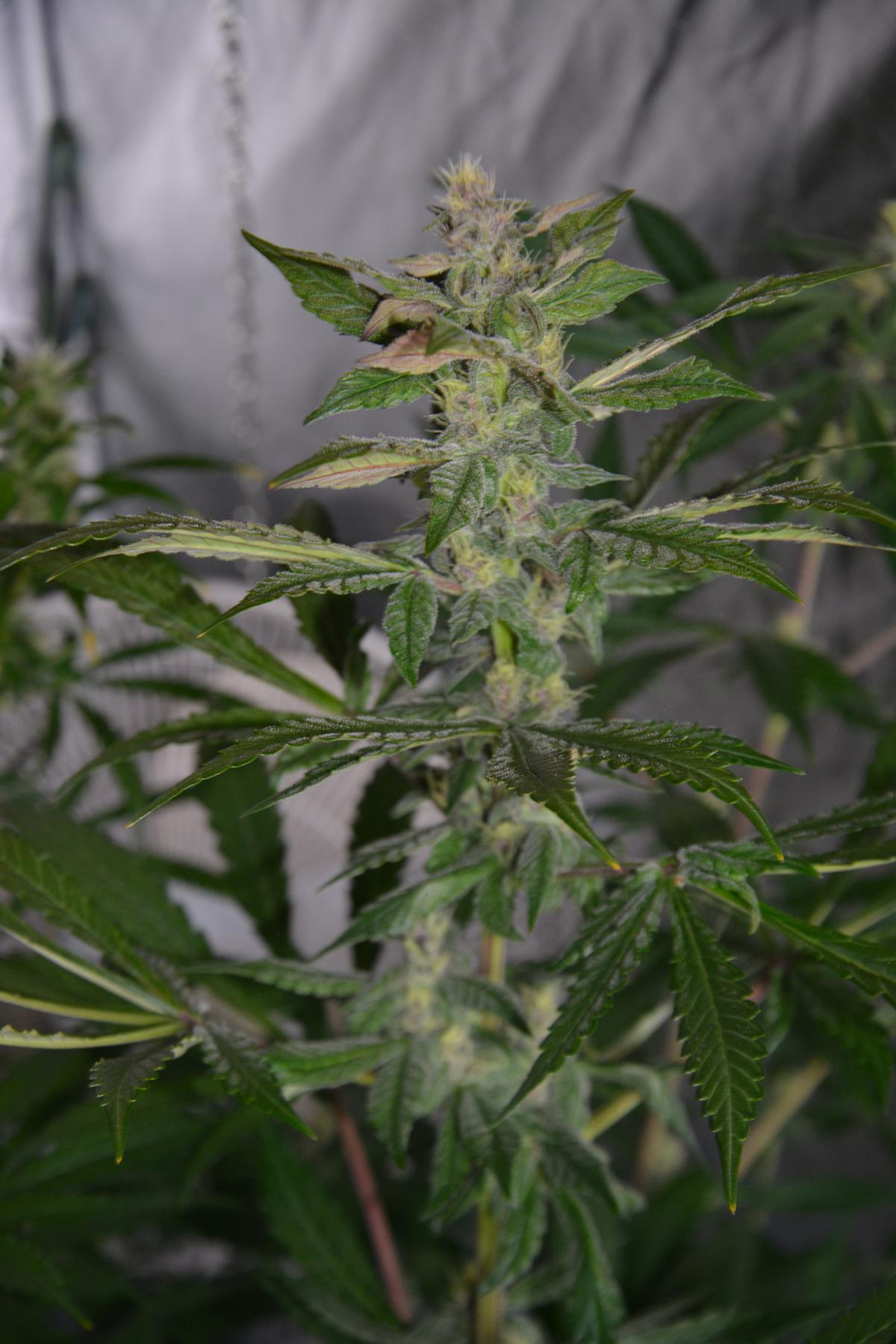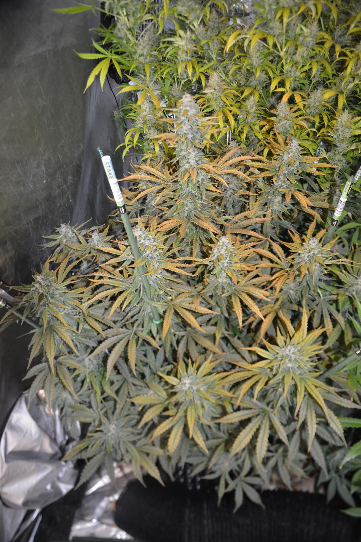 The Cookie is most developed in terms of flowering, smelling lovely and lots of frost but I think she's been overcooked a little, as some of her bigger leaves are turning rusty.... any suggestions? I've raised her light and might drop her feed to 0.8.
