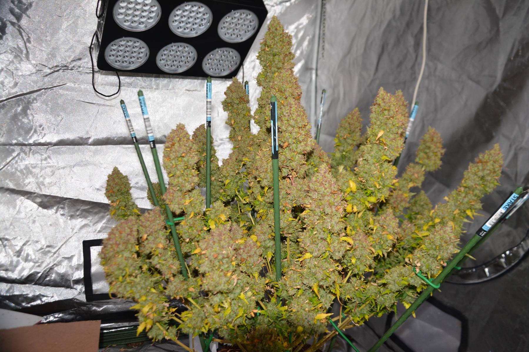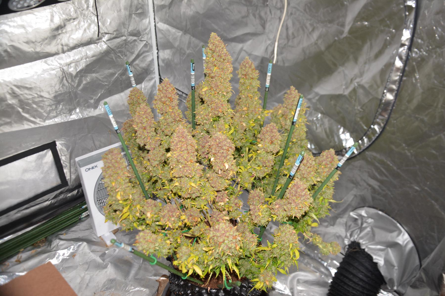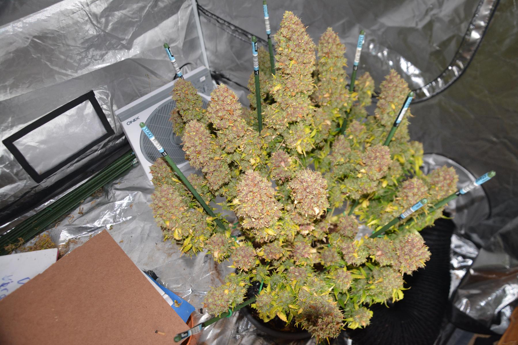 The Colorado Cookie was taken down on day 79. I just trimmed her in the pot, then cut her off at the base and hung her upside down in a cardboard box for 10 days till the stems snapped. She's now been broken down into buds and is curing in a jar with a few Boveda 62's.