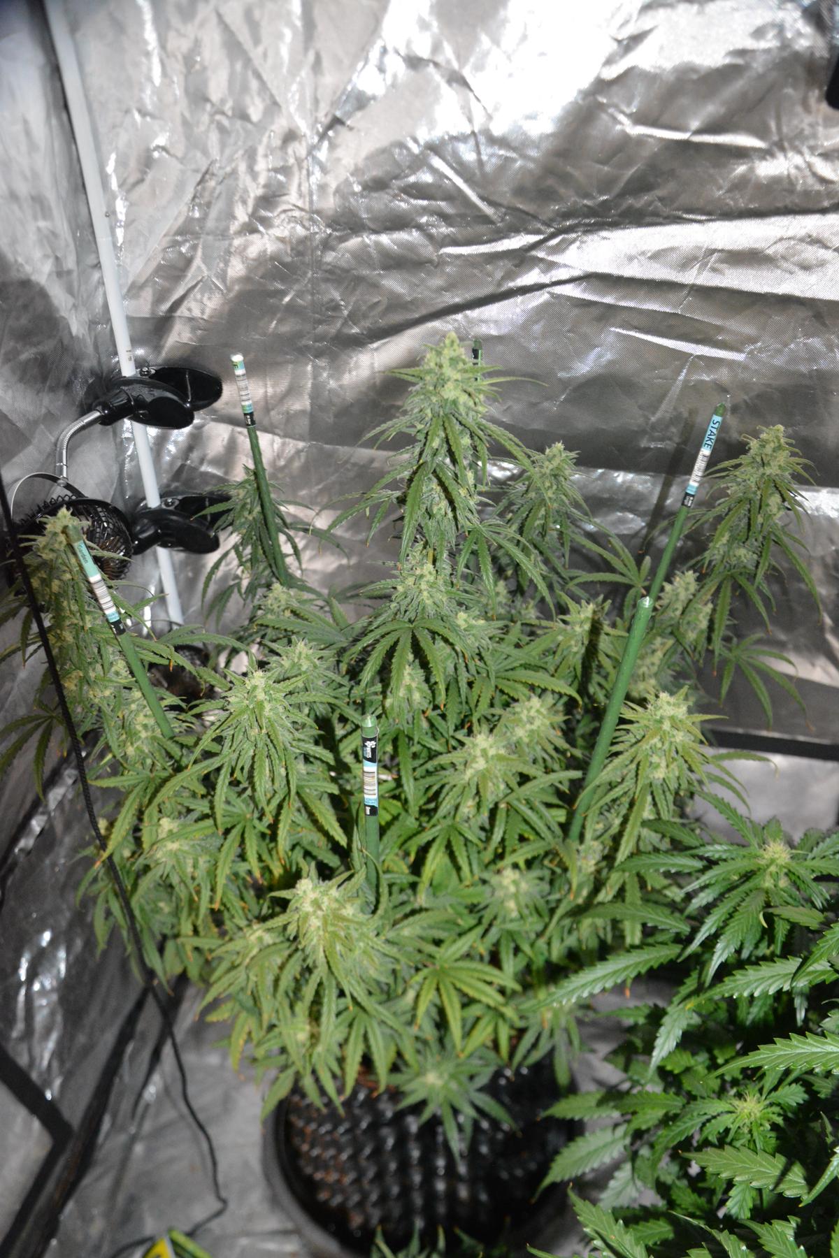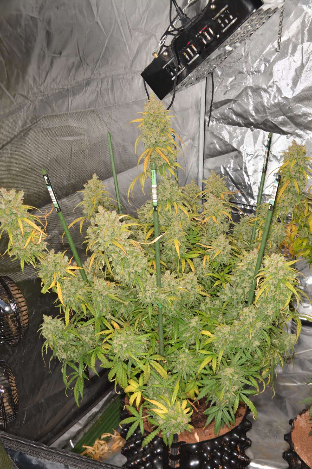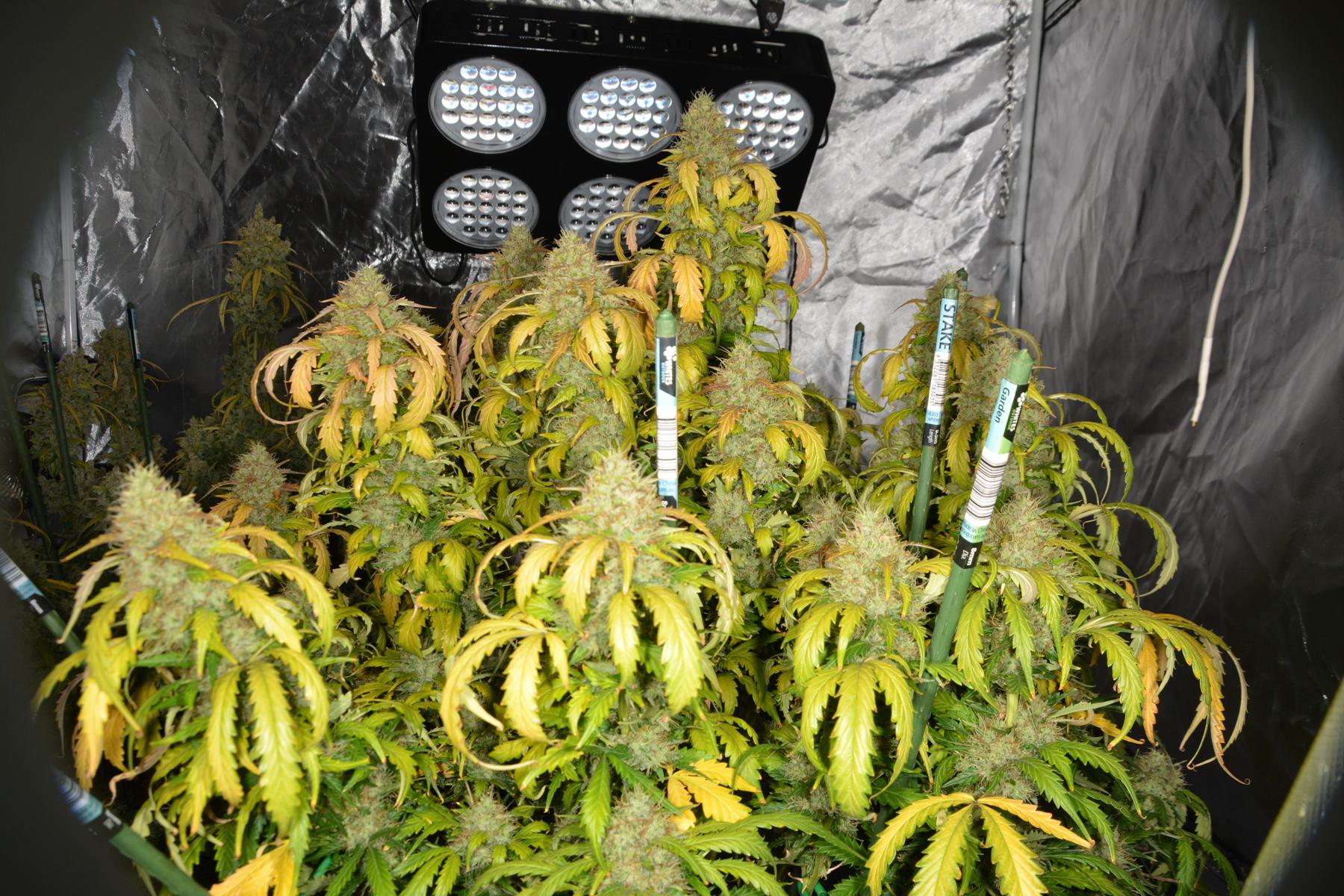 The Colorado Cookie was taken down on day 79. I just trimmed her in the pot, then cut her off at the base and hung her upside down in a cardboard box for 10 days till the stems snapped. She's now been broken down into buds and is curing in a jar with a few Boveda 62's.
