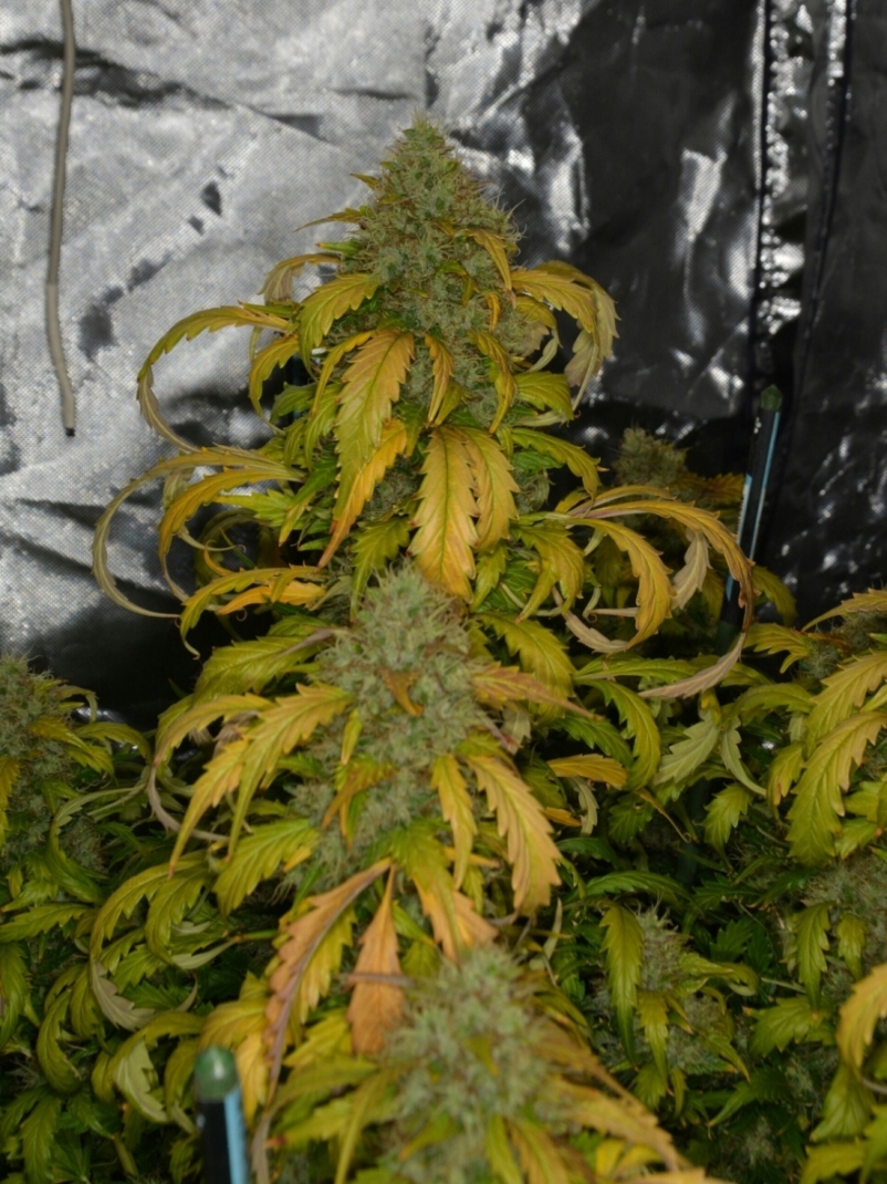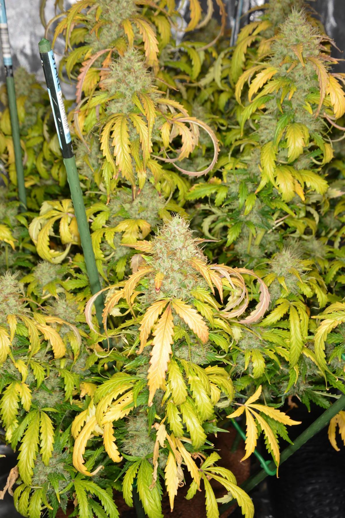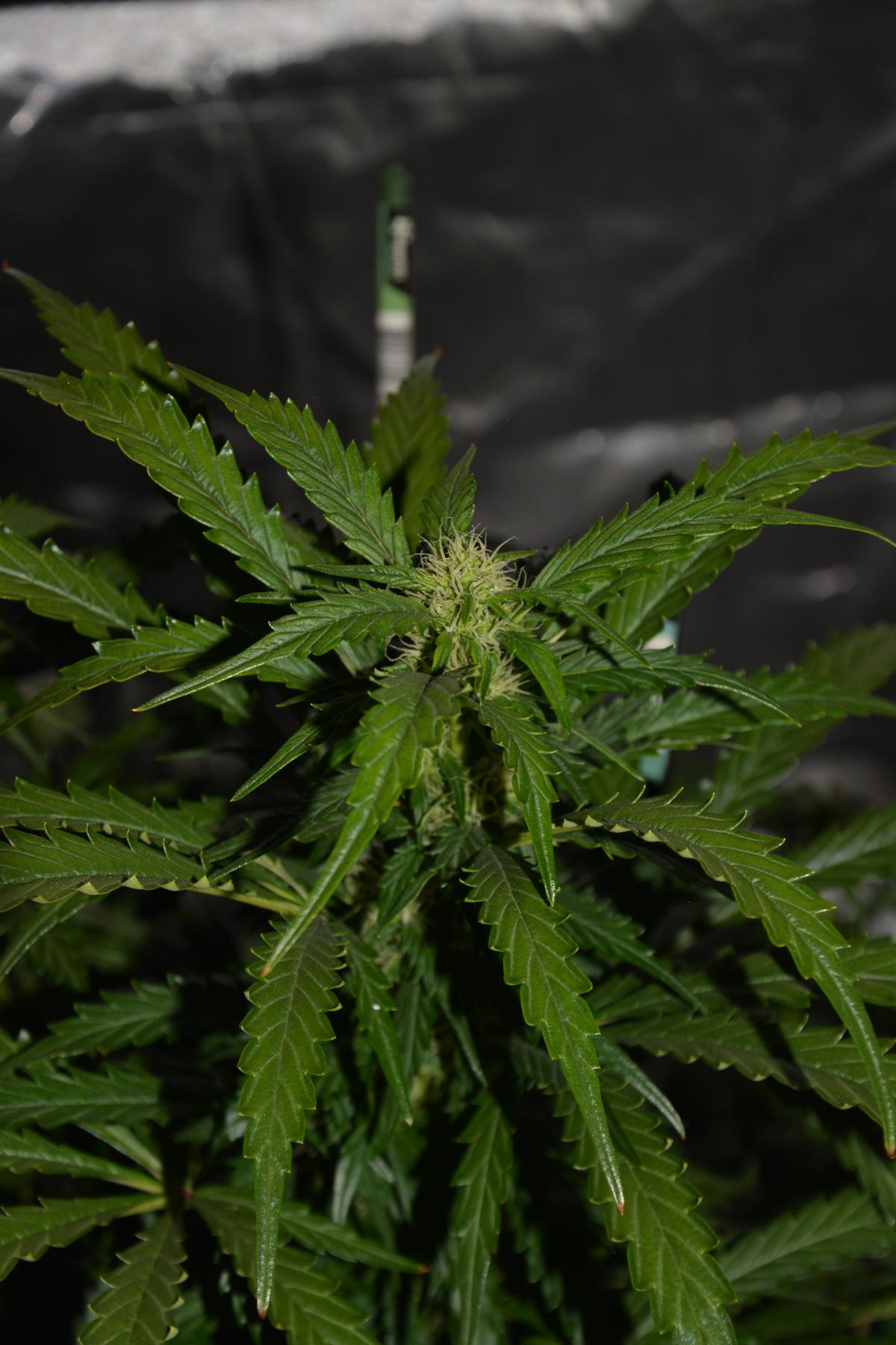 I'll harvest her tomorrow night. I usually take stems off and trim them one by one, but in this case I will trim the plant in her pot and get a few pics. I'm smoking some Colorado Cookie right now (from my last harvest) - it's my favourite, so I'm disappointed I'm not getting a bigger haul.
