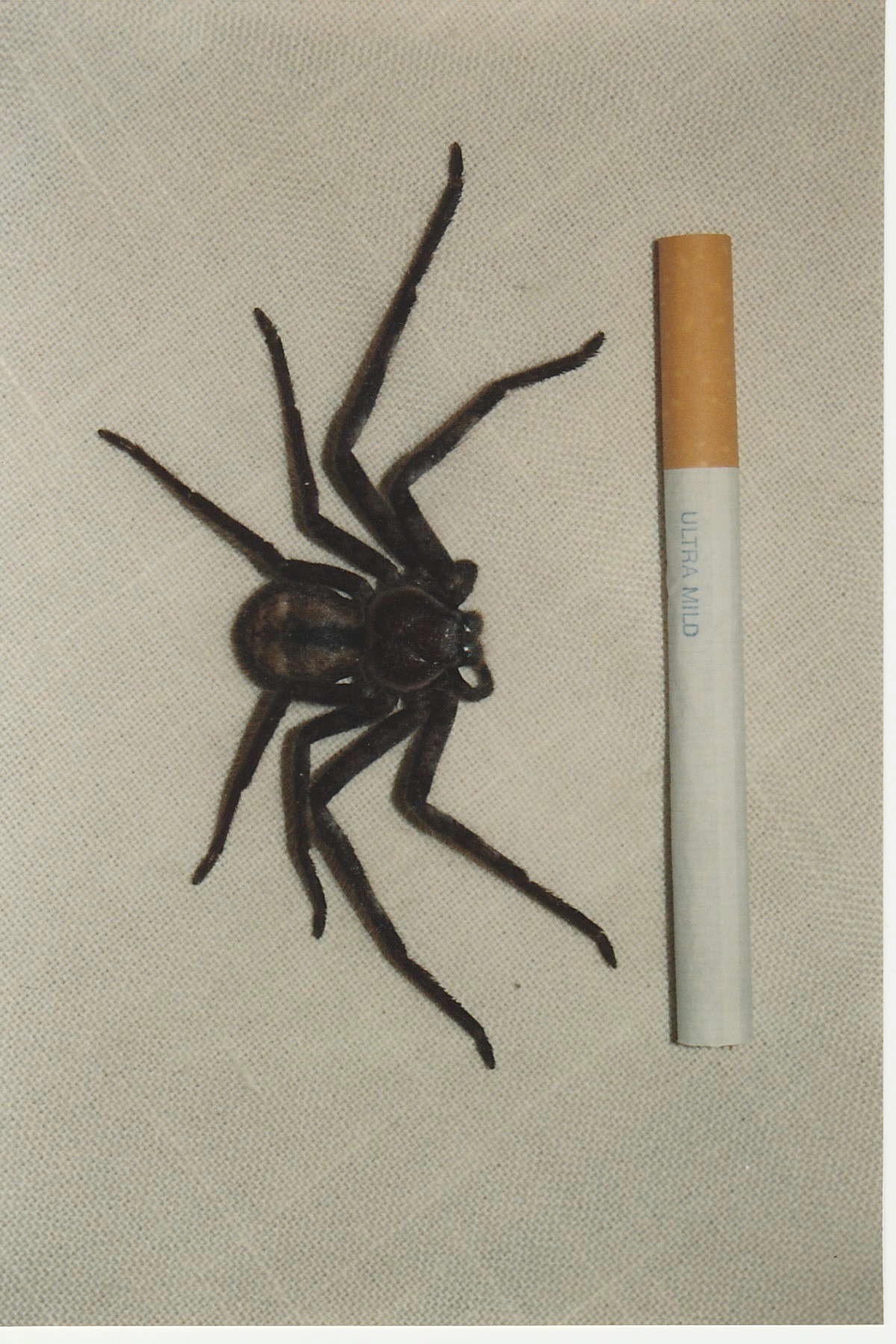 the one larger than the ciggy, is a new species tee...?? dont look orb or, hunts....??............... but it looks like a baby one for sure !!......... WTF is mum & dad ??......!! Maybe Huntsmen are a bit like Brown snakes in that there's a massive variation in colour and markings? Kill first then research later after a joint. I hope it wasn't a Wolf spider? I got a spider chart and a snake ID book as secret Santa presents at work, so I'll have to take a butchers.