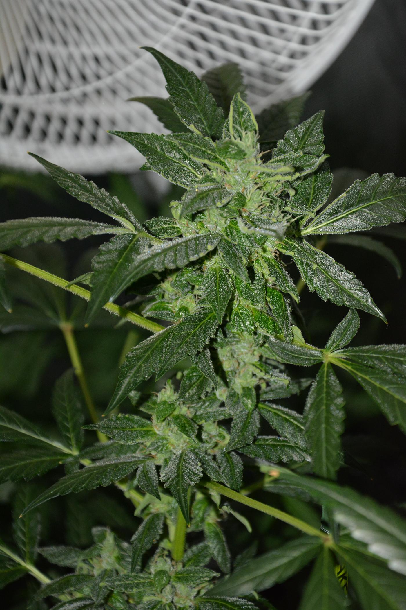 Critical Jack 2 is massive for an auto (1.55m from the floor), the light is up at max height and I have about 6 inches clearance. She's flowering nicely, I had to remove some of the lower feeble stems, and I also bent some of the main stems at the sides over towards the free space at the back to stop the buds being crushed as the tent sucks in, and also to give me some space to pull her away from the Chronic Ryder.... it's getting a bit congested in the middle of the tent. She gets light from her own Helios Pro 2 and a bit of spread from the Helios 6.