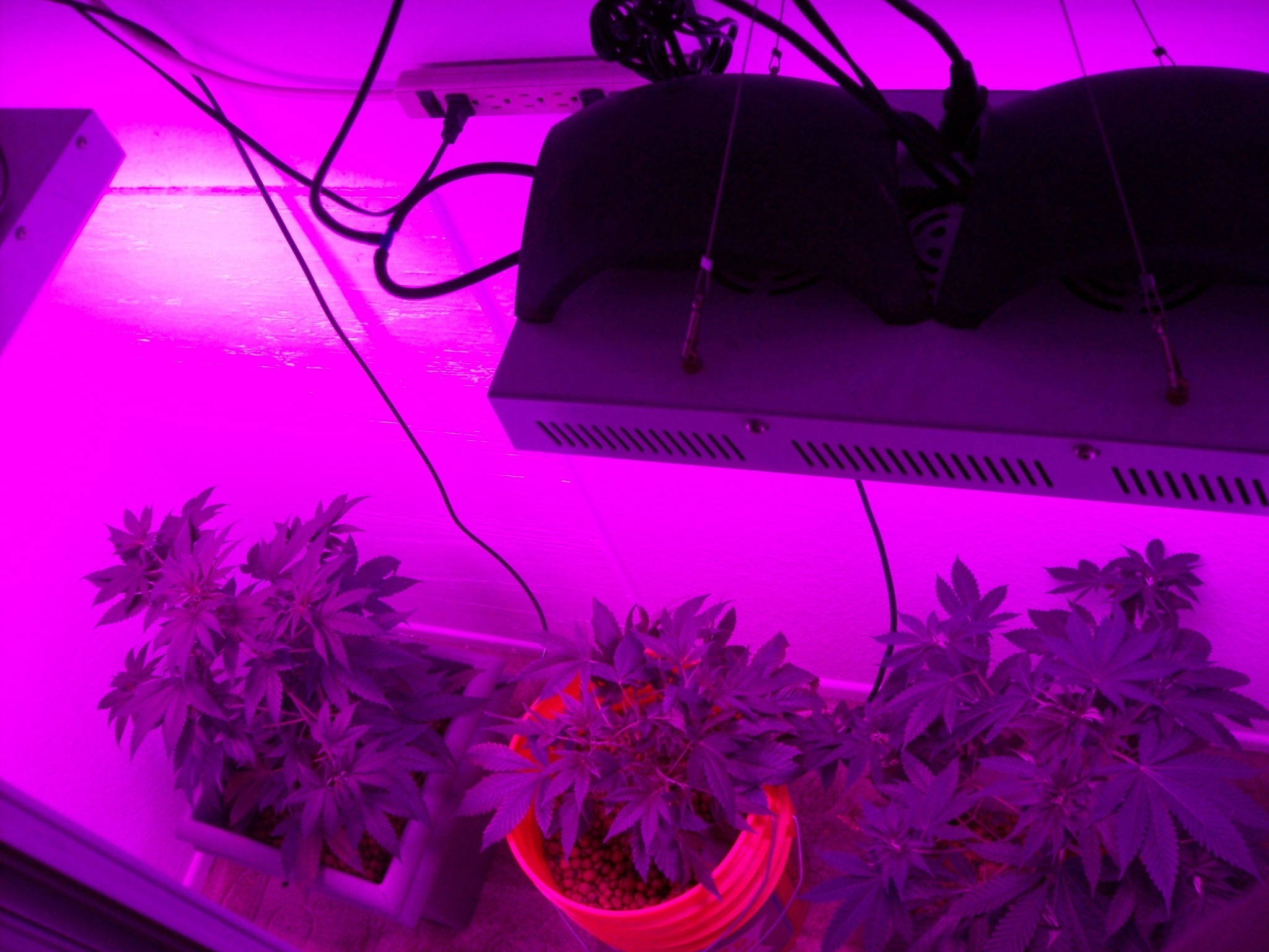 Now the big question. There's quite a bit of stretch since the plants kinda crowded each other out (excepting the runt, which left mostly exposed kept dense and short foliage.) To clone, or not to clone? I'm thinking of popping clones from the ends of the branches, letting two new branches form behind each cut at the internodes, training for a week or so, and then throwing them into flower! I can pop the buckets to the walls, and run my NFT channels in there for extra flower sites from the clones once I've sealed the ends back up so they don't leak (because they leak like a sieve without some sort of gasket!)