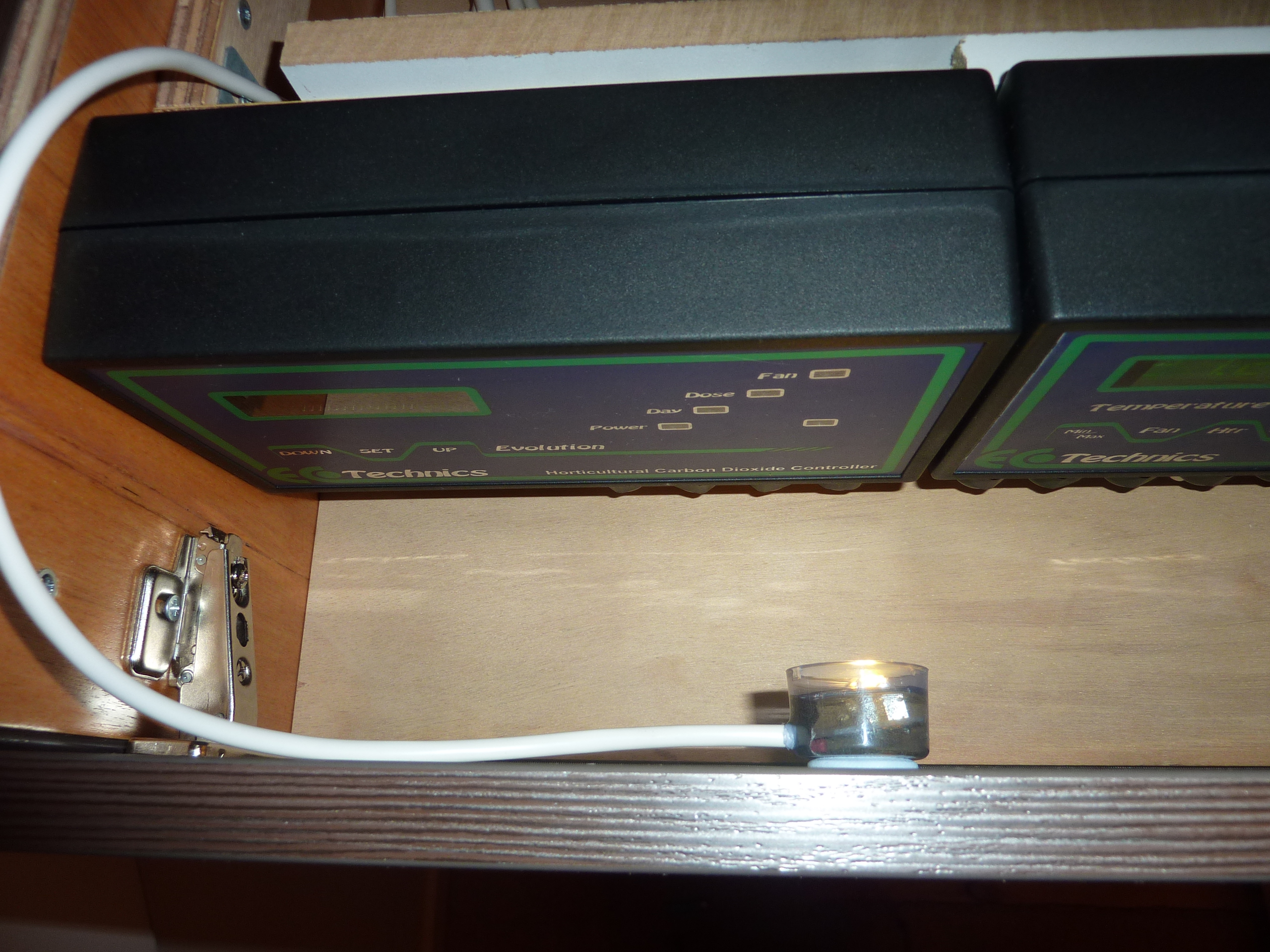 Secondly, and this is no fault of theirs, but the CO2 controller has a light sensor in it, to allow it to dose CO2 only when lights are on. I positioned the CO2 controller outside the growing chamber, so It could not tell if lights were on or not. I didn't want to rip the controller off and reposition it inside, so came up with the idea to have a little light attached to the inside of the door. the light would share the same plug socket and timer as the grow light, so that when the Helios is on, the little light illuminates and is detected by the CO2 controller.