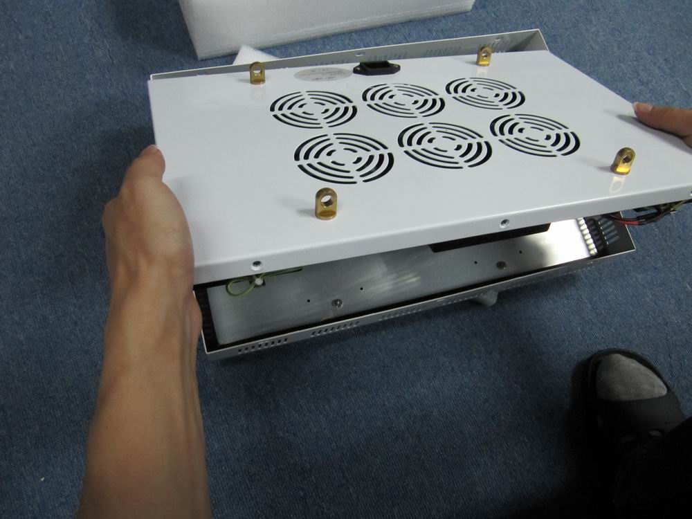 Lay the led grow light face down (fans facing you) on a soft towel , polystyrene block etc to avoid damage to face of led grow light.