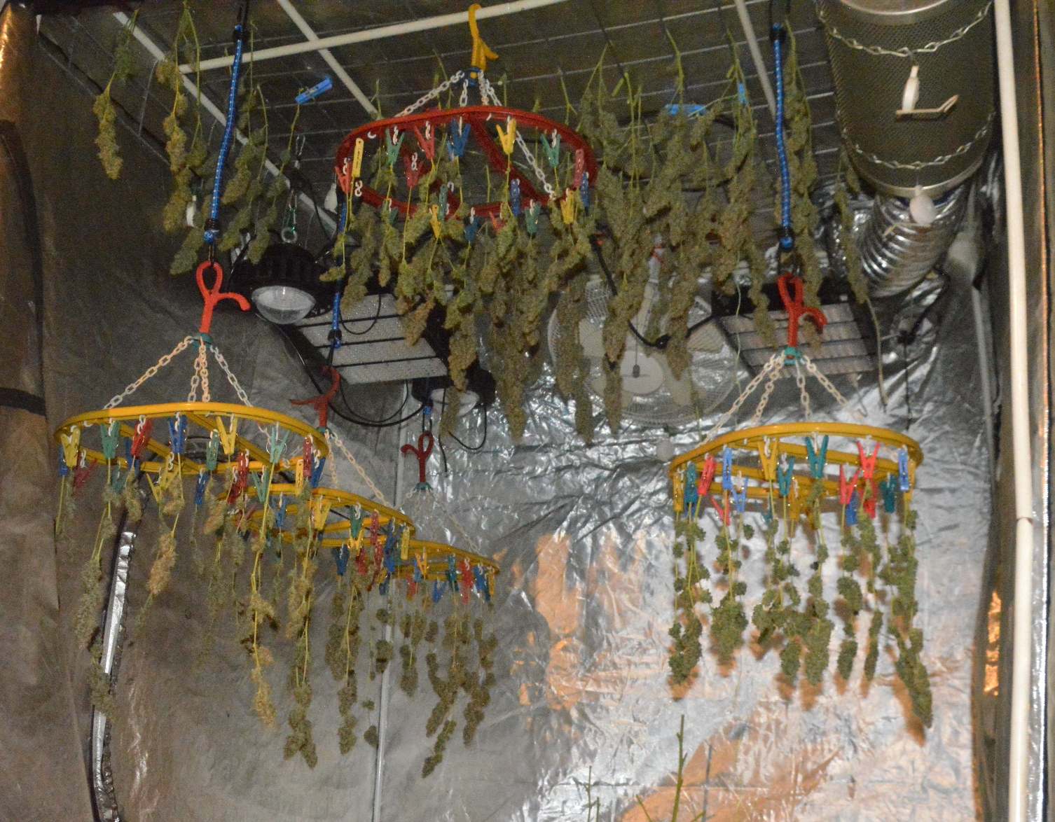 I hung the longer stems in some boxes, and clipped the shorter stems to a few sock hangers. I still had a load of smaller buds and stems to dry, and suddenly remembered I had this hanging net thingy I bought and never used a few years back.... all stashed in a box, somewhere in the piles of boxes in the lock up.... found it quite quickly, and hung it up in the tent, after scattering the last of the bud over it.