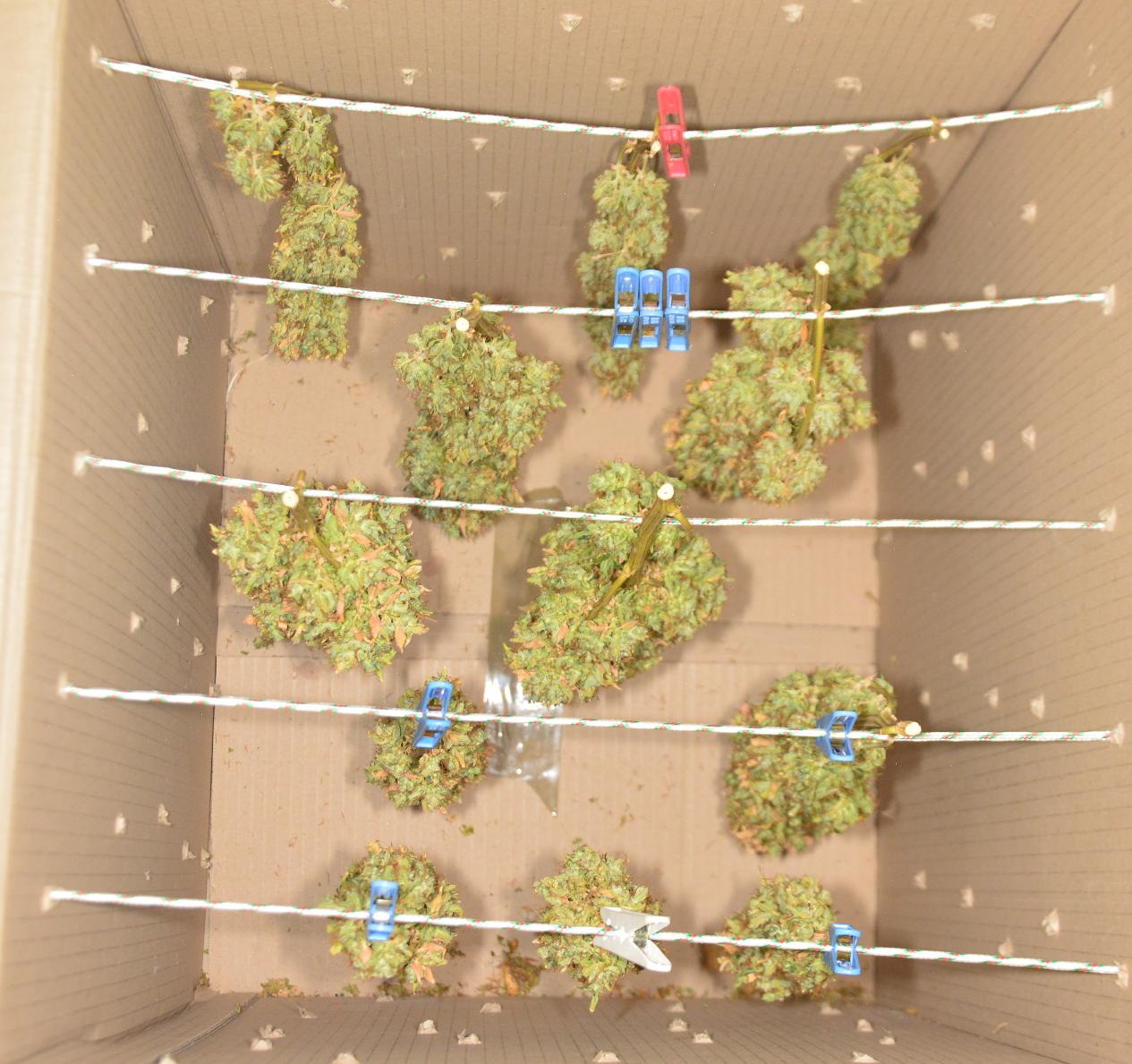 I ran out of boxes, so I have just one box full of stems drying, and the rest, I hung up in the tent.