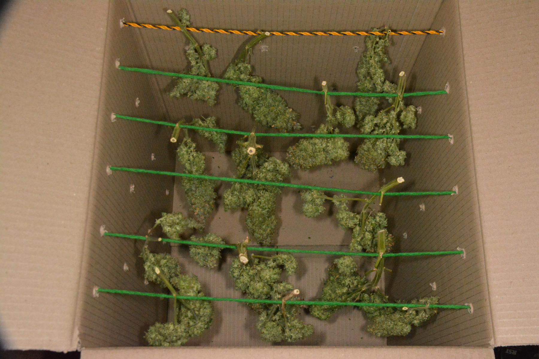 I hang the longer stems in perforated cardboard boxes, and brown paper bag the rest. Here's the PE (7 days dried) and NQ (6 days dried) in one box today.....