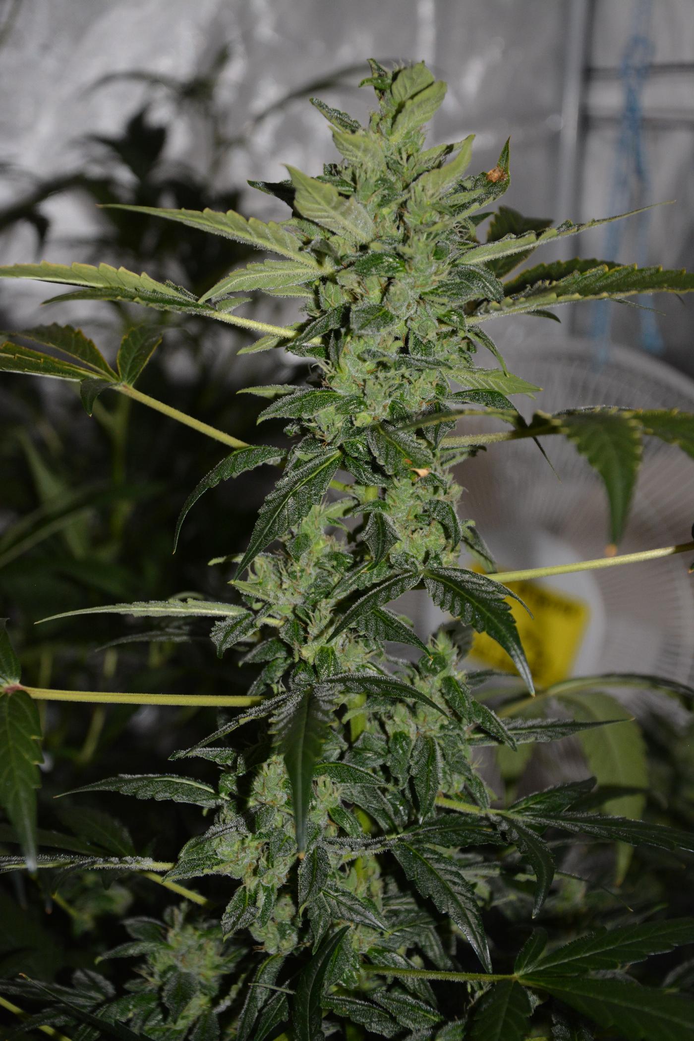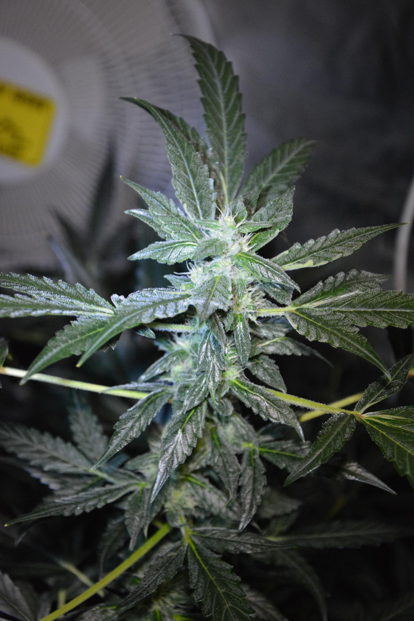 Critical Jack 2 is massive for an auto (1.55m from the floor), the light is up at max height and I have about 6 inches clearance. She's flowering nicely, I had to remove some of the lower feeble stems, and I also bent some of the main stems at the sides over towards the free space at the back to stop the buds being crushed as the tent sucks in, and also to give me some space to pull her away from the Chronic Ryder.... it's getting a bit congested in the middle of the tent. She gets light from her own Helios Pro 2 and a bit of spread from the Helios 6.