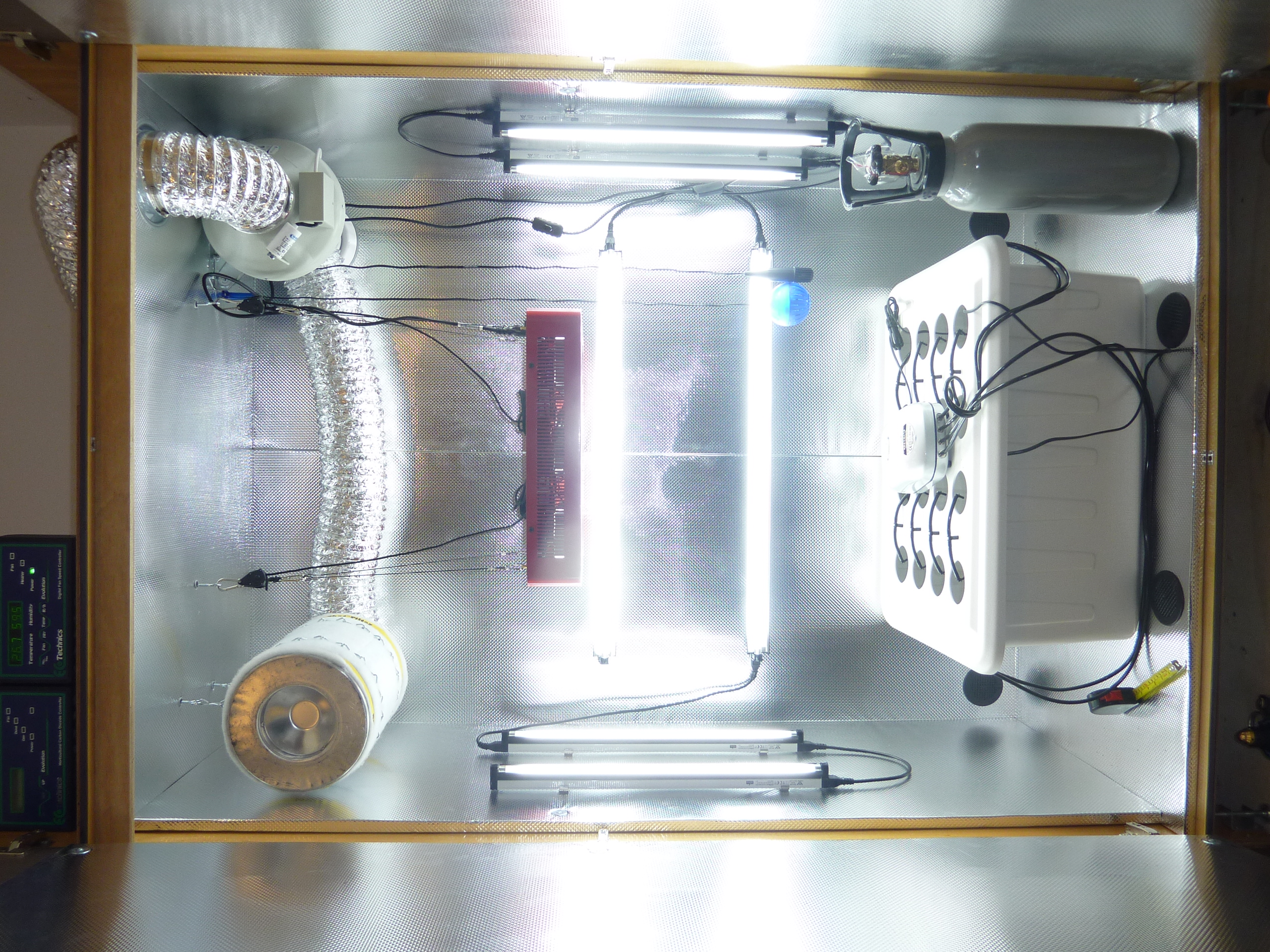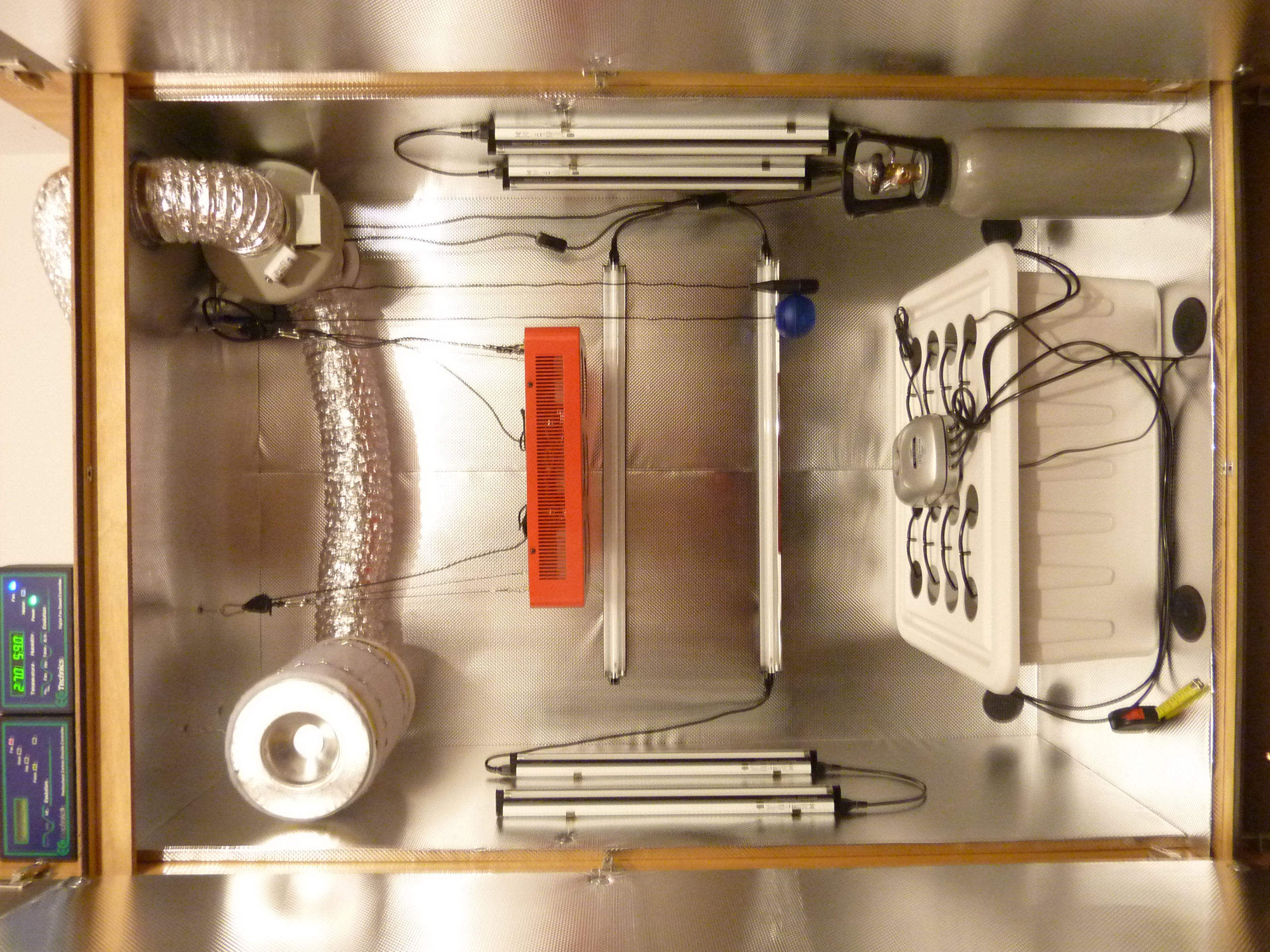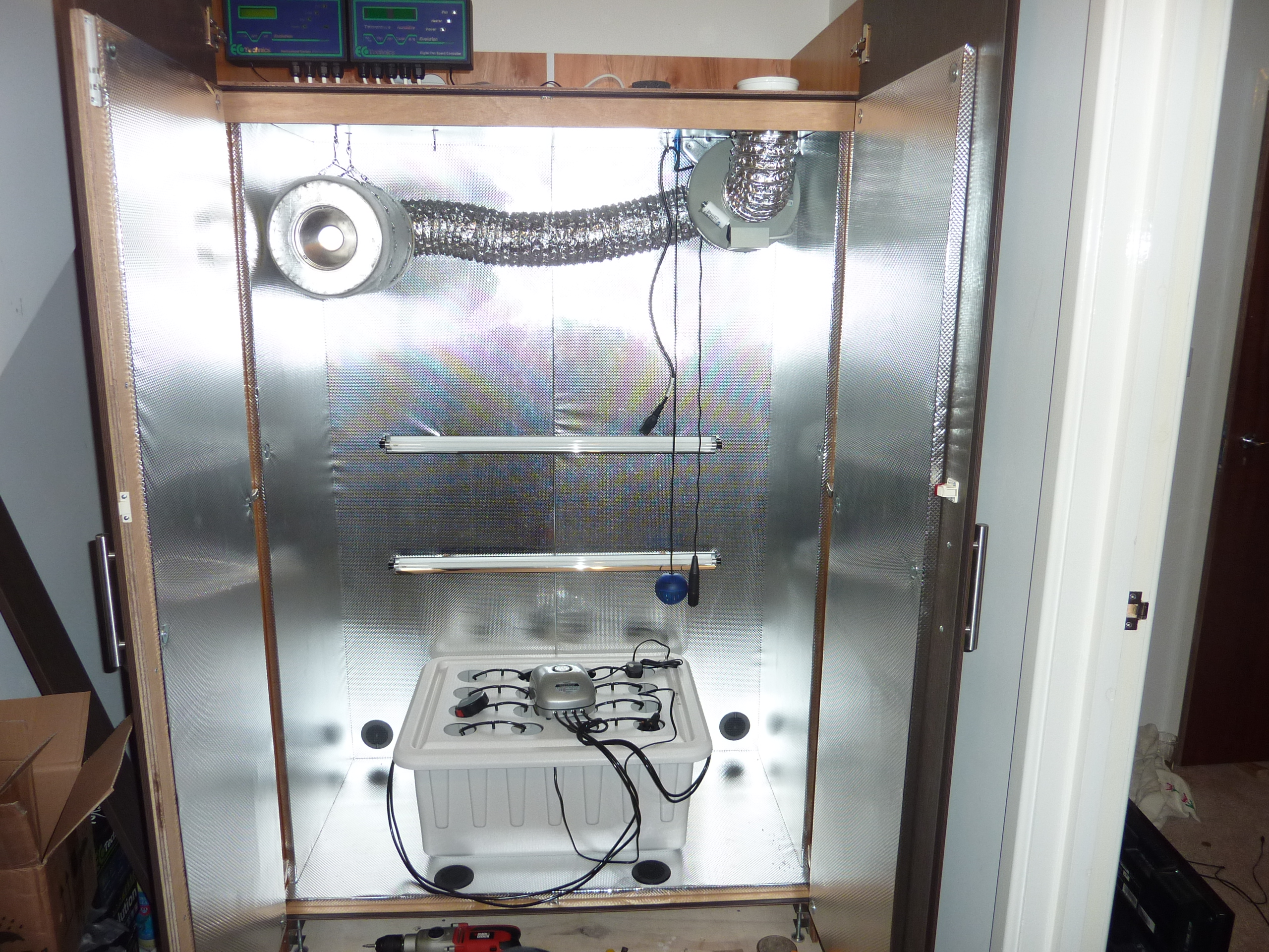 Here's the 'drobe at present, I fitted the fan and filter, positioned the temp and CO2 sensors and am putting in T5 side lighting. You can see my Bubbleponic box as well.