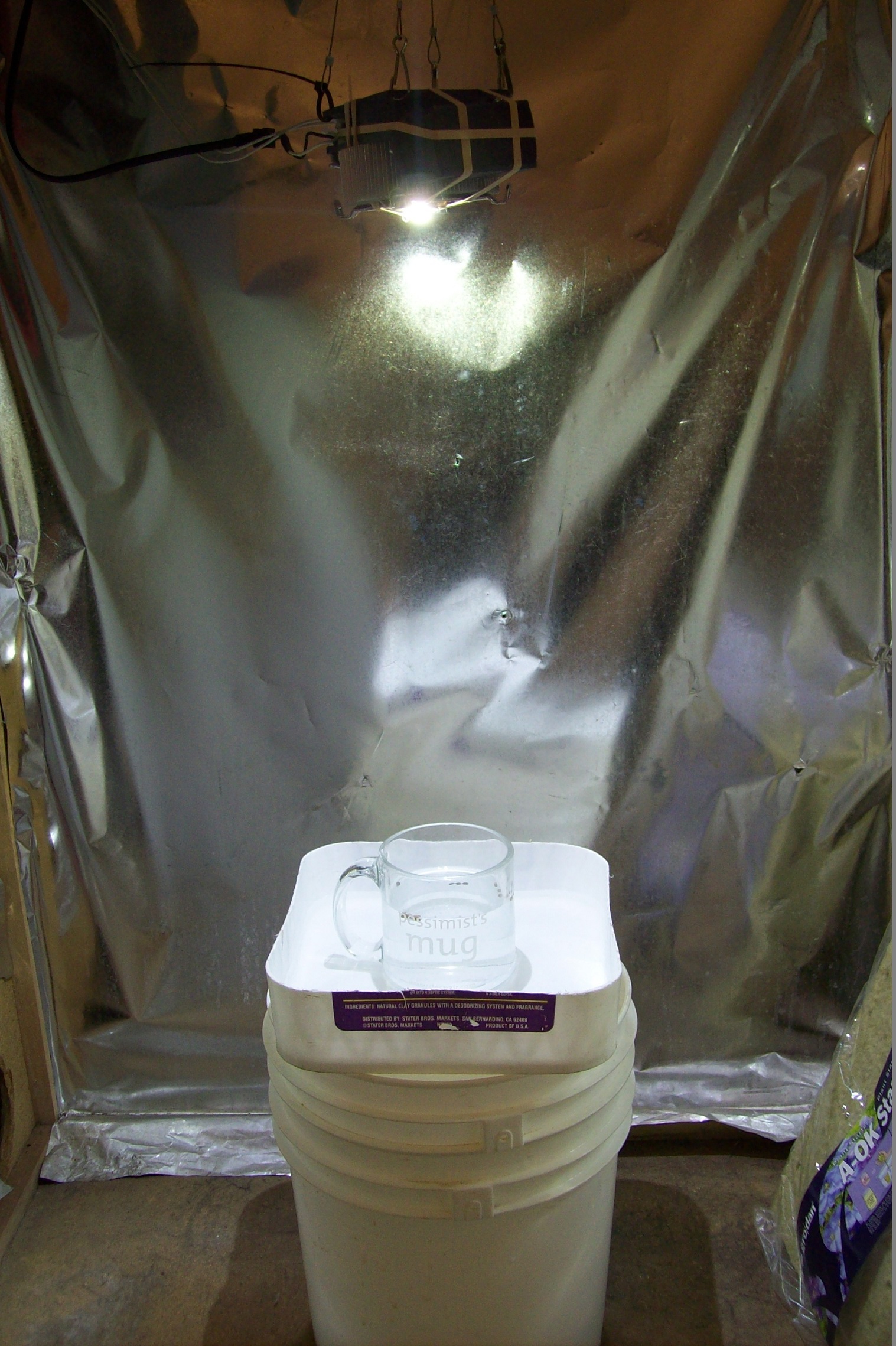 Germination area is simple. Glass of water, for seeds, tray of water for rockwool implantation after seeds germinate, under a 15w LED driven at 6w (12V @ 500mA) LED is a Cree MK-R on a SinkPad aluminum 20mm star. I'm just using the power supply from an old phone base wall wart to drive it, and a 12V 100ma wall wart for the fan.